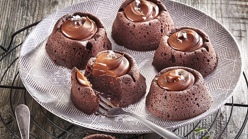 - Pečeme v troubě vyhřáté na 160 °C asi 20 minut. Necháme zcela vychladnout, pak je vyklopíme a do vzniklých důlků nastříkáme pomocí cukrářského sáčku čokoládový karamel. Před podáváním posypeme solí.