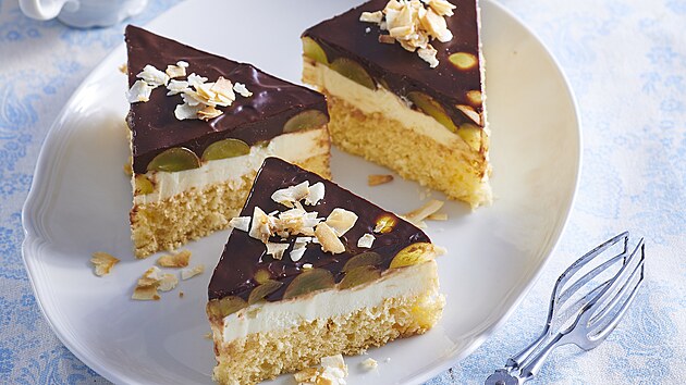 - Po ztuhnutí povrch potřeme rozpuštěnou čokoládovou polevou. Polevu necháme ztuhnout a pak moučník nakrájíme na řezy. Povrch ozdobíme kokosem.