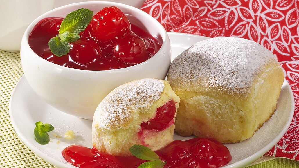 - Třešňovou šťávu nalijeme do kastrůlku, osladíme ji a přivedeme k varu. Pudinkový prášek rozmícháme v troše vody a vlijeme do vroucí šťávy. Omáčku za stálého míchání vaříme, dokud nezhousne. Poté přidáme griotku a zbylé třešně. Vychladlé buchtičky podáváme pocukrované a přelité třešňovou omáčkou.