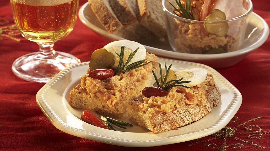 - Plátky chleba potřeme pomazánkou a rozdělíme na čtvrtinky. Každý chlebíček ozdobíme plátkem vajíčka, kouskem okurky a papriky a bylinkou.