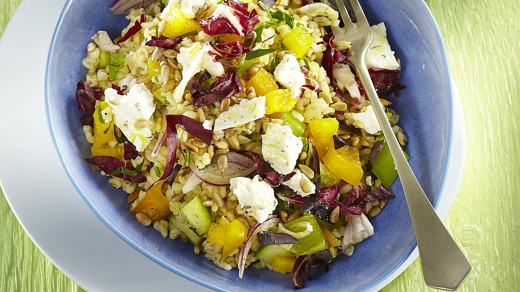 - Do mísy přisypeme bulgur a dobře jej promícháme s ochucenou zeleninou. Salát rozdělíme do misek, rozdrobíme na něj kozí sýr, posypeme opraženými slunečnicovými semínky a ozdobíme nasekanou petrželkou.