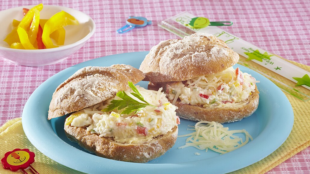 - Bulky rozkrojíme a namažeme na ně pomazánku. Ozdobíme ji kupičkou zbylého nastrouhaného sýra a lístkem petržele.
