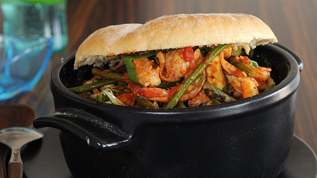 - Mezitím očistíme krevety, rybí maso nakrájíme na kostky 2x2 cm a kalamáry na kolečka. V pánvi rozpálíme olej a osmahneme na něm kalamáry dozlatova. Přidáme nakrájenou cibuli a česnek, taky orestujeme, pak zasypeme kari kořením a opět osmahneme. Přidáme nakrájenou rybu, zalijeme sekanými rajčaty a dusíme 2 minuty. Nyní přidáme očistěné fazolky a krevety a podusíme ještě 5 minut. Nakonec vmícháme zelené bylinky.
