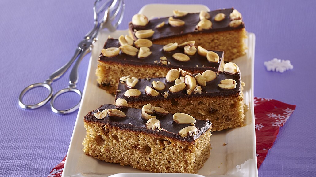 - Přendáme ho do obdélníkové formy a uhladíme. Pečeme ve vyhřáté troubě při 180 °C asi 30 minut. Korpus necháme vychladnout. Pak ho polijeme čokoládovou polevou, kterou připravíme dle návodu na obalu, a posypeme půlkami arašídů. Necháme zatuhnout a nakrájíme na menší obdélníčky.