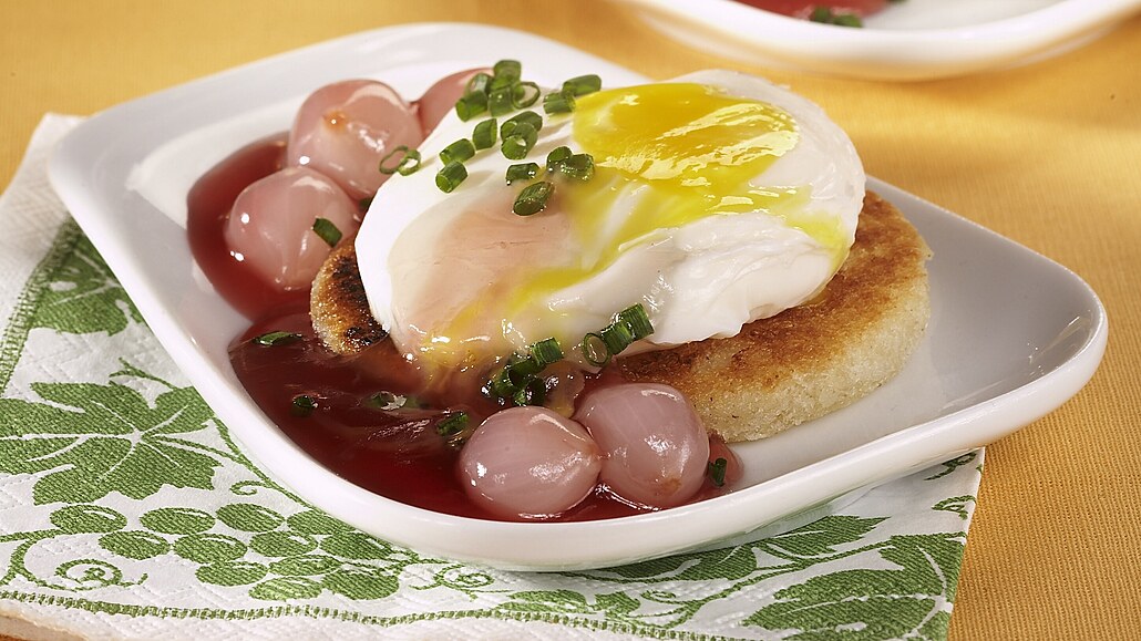 - Na talířky dáme vždy 2 toasty, na ně položíme vejce, přelijeme omáčkou, přidáme cibulky a ozdobíme pažitkou.