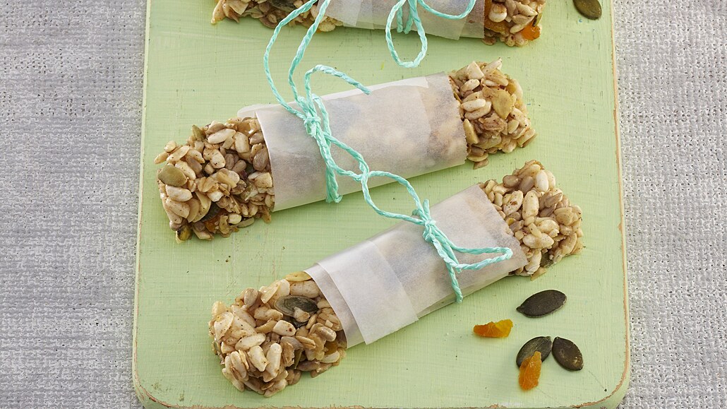 - Směs rovnoměrně naneseme na plech vyložený pečicím papírem. Pak ji překryjeme pečicím papírem a zatížíme. Necháme ztuhnout v ledničce a pak nakrájíme na obdélníčky.