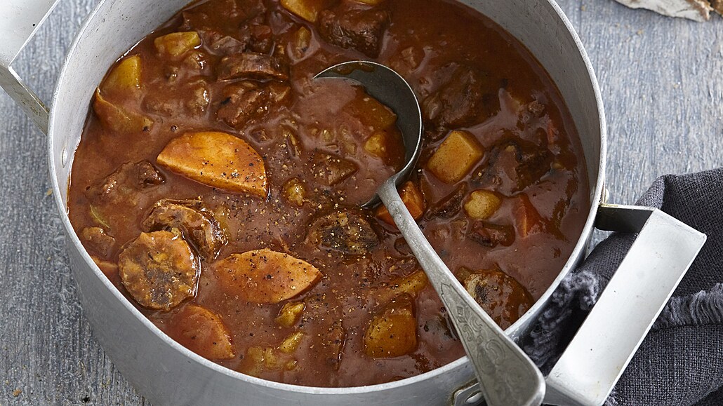 - Zalijeme asi 800 ml vody, přidáme brambory a rajský protlak. Za stálého míchání zvolna vaříme, až budou brambory a maso měkké a omáčka zhoustne. Nakonec guláš podle chuti osolíme a opepříme. (Můžeme do něj vmíchat rozdrolenou majoránku.)