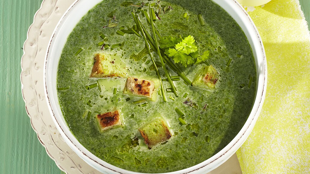 - Ve smetaně na vaření rozmícháme 2 žloutky a za stálého míchání smetanu vlijeme do polévky. Přivedeme ji téměř k varu, sporák vypneme a polévku dochutíme solí a pepřem. Polévku rozdělíme do talířů, ozdobíme petrželkou a pažitkou. Podáváme s opečenými chlebovými krutony.