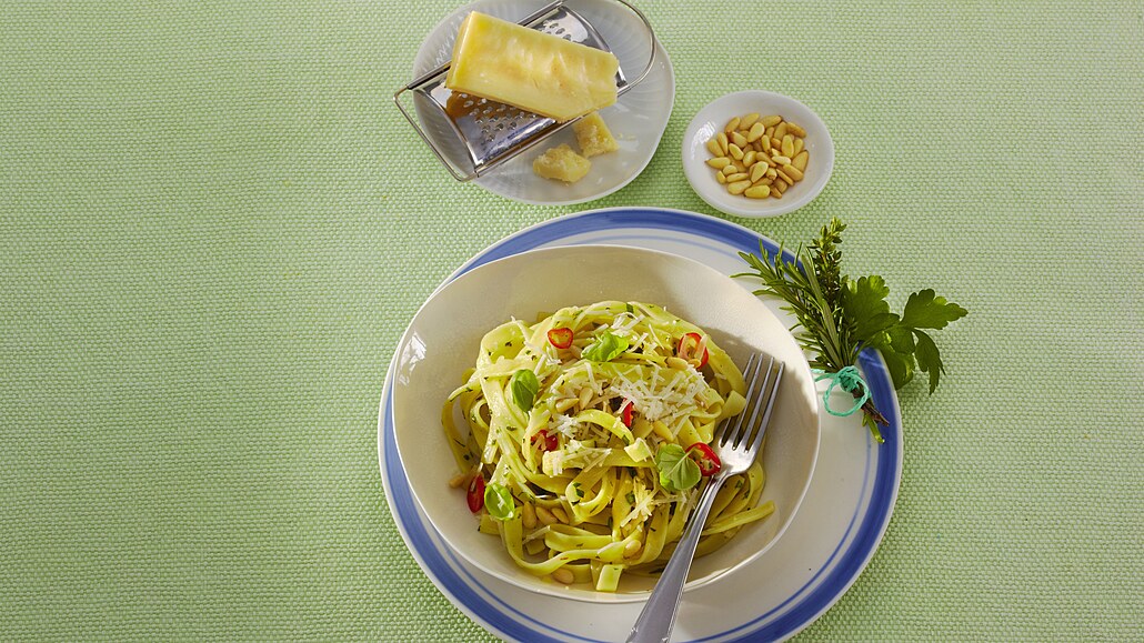 - Hotové těstoviny slijeme a necháme okapat. Vmícháme je k ostatním surovinám v pánvi a krátce prohřejeme. Těstoviny rozdělíme na talíře a posypeme pecorinem, lístky bazalky a piniovými semínky.