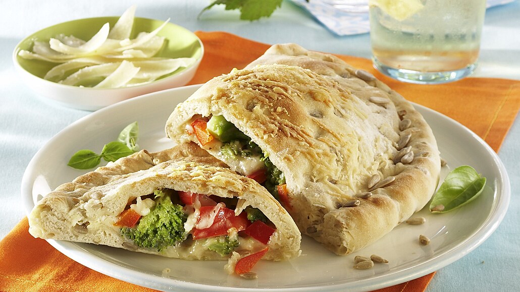 - Těsto rozválíme na 4 kulaté placky. Na polovinu každé placky dáme náplň, těsto přehneme a okraje důkladně přimáčkneme. Calzone pečeme v dobře vyhřáté troubě při 240 °C asi 10-12 minut dozlatova.