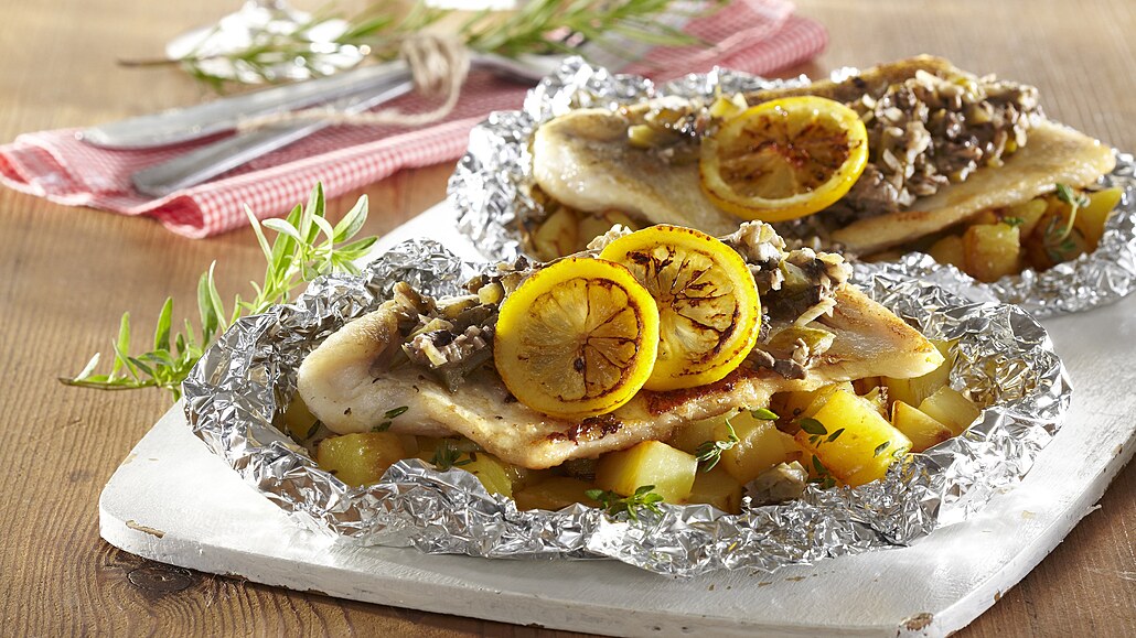 - Brambory nakrájíme na kostičky a opečeme na oleji. Pak je rozdělíme na větší pláty alobalu a položíme na ně opečené porce candáta.