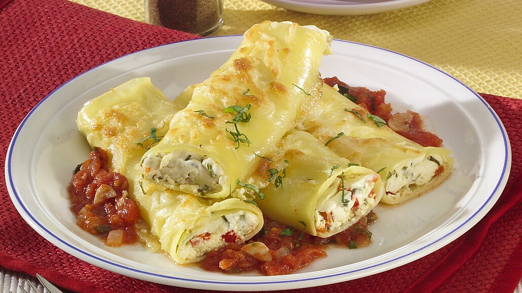 - Oloupeme cibuli a česnek a nakrájíme nadrobno. Na pánvi rozehřejeme olivový olej, přidáme cibuli a česnek, které necháme zesklovatět. Rajčata omyjeme, nakrájíme a dáme na cibuli. Osolíme, dochutíme čerstvě mletým pepřem, přidáme sekanou bazalku. Přiklopíme poklici a necháme krátce podusit. Zapečené canelloni rozdělíme na talíře a podáváme s rajskou omáčkou.