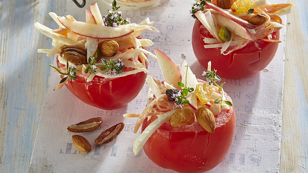 - Celerovou pomazánku vložíme do rajčat zbavených dužiny a podáváme posypanou například mandlemi či jinými oříšky.