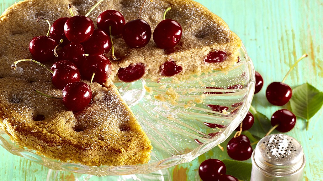 - Dortovou formu o průměru 28 cm vymažeme tukem. Povrch rovnoměrně pokryjeme višněmi a pečeme v předehřáté troubě při teplotě 175 °C asi 60 minut dorůžova. Po upečení necháme koláč vychladnout, rozkrájíme jej na jednotlivé porce a posypeme moučkovým cukrem.