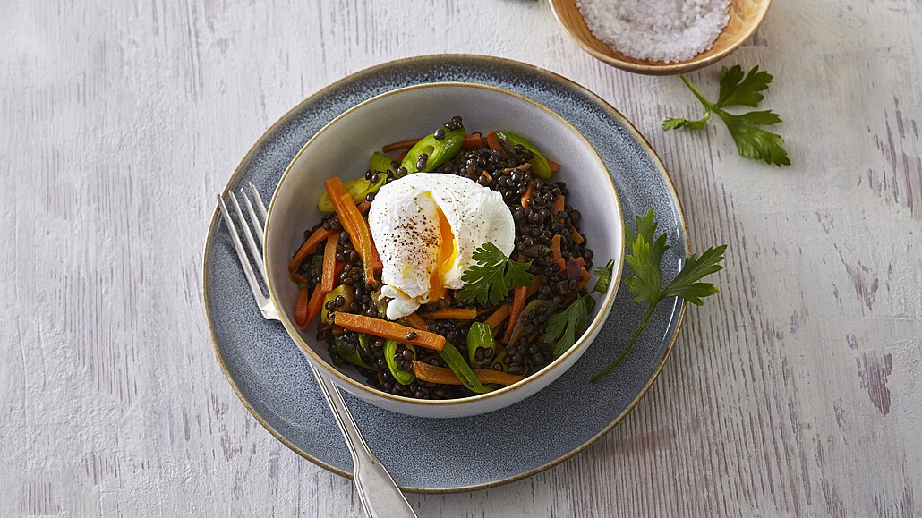 - K čočce přidáme jarní cibulku, petrželku, promícháme a podáváme se zastřenými vejci dochucenými solí a pepřem.
