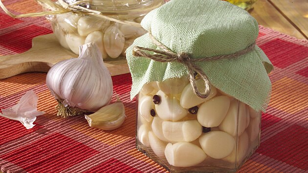 - Pak česnek znovu vložíme asi na 1 minutu do vroucí vody, osušíme a spolu s 4 - 5 kuličkami nového koření naskládáme do sklenic. Zalijeme vinným octem.
