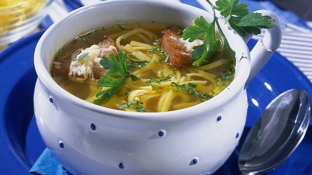 - Česnek oloupeme a prolisujeme. Do hrnce nalijeme jeden litr vody, přidáme bobkový list a rozdrcený česnek. Lehce osolíme, opepříme a vodu přivedeme k varu. Krátce povaříme a přidáme jemné polévkové nudličky.