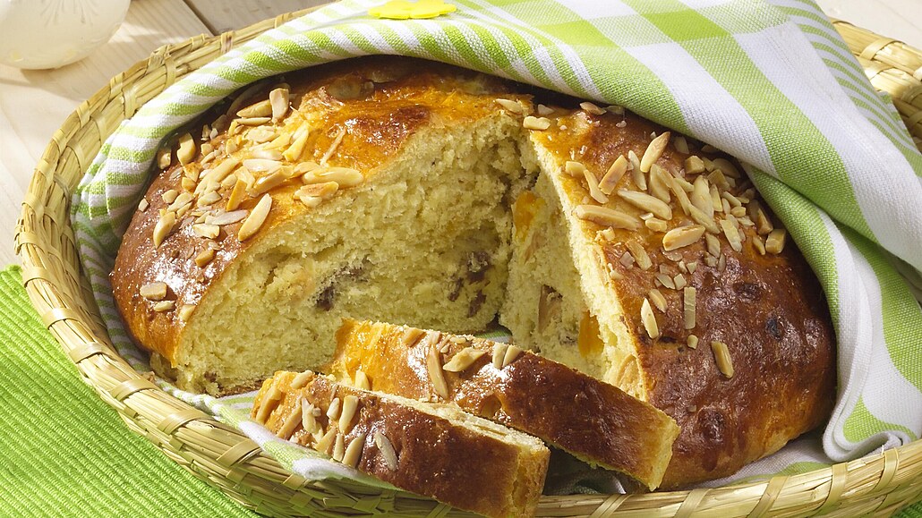 - Z vykynutého těsta utvoříme bochánek, přendáme ho na plech, vyložený pečicím papírem, a necháme opět 15 minut kynout. Pak ho potřeme rozšlehaným bílkem, nahoře nakrojíme ostrým nožem tvar kříže a celý bochánek posypeme nahrubo nakrájenými mandlemi. Pečeme v předehřáté troubě při 180 °C přibližně 40 minut. Špejlí zkusíme, zda je těsto dobře propečené. Hotový, ještě teplý mazanec posypeme práškovým cukrem.