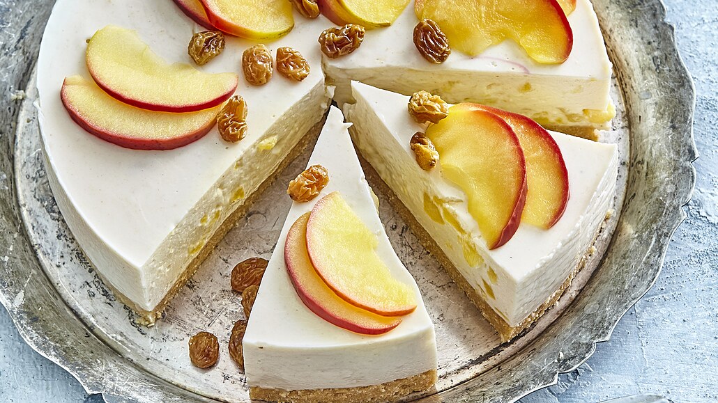 - Horkou želatinu vlijeme do náplně, přidáme nakrájená jablka, promícháme a nalijeme na korpus. Dáme vychladit, pak sejmeme formu a povrch ozdobíme plátky jablek a rozinkami.