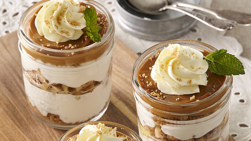 - Na dno skleniček nasypeme sušenkovou směs (trochu ponecháme stranou na posypání), přidáme vrstvu krému, jablečnou vrstvu, opět vrstvu krému a nakonec karamelovou vrstvu. Před podáváním dozdobíme vyšlehanou smetanou a posypeme sušenkami.