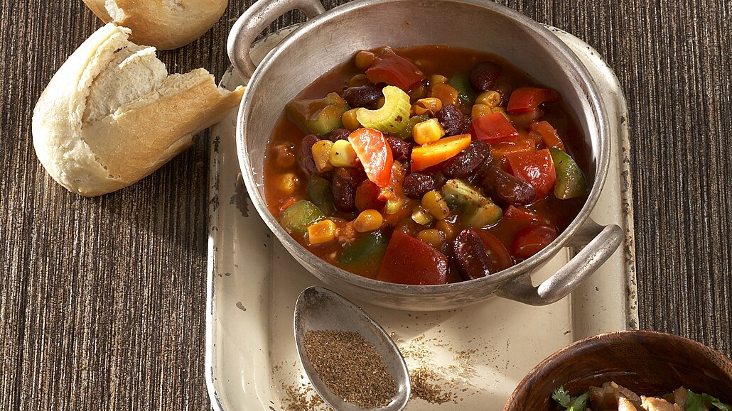 - Zeleninu zalijeme červeným vínem a 300 ml vody. Promícháme a pozvolna vaříme 10 minut. Pak přimícháme červené fazolky a kečup. Osolíme, opepříme a přidáme na čtvrtky nakrájená keříčková rajčata. Pozvolna vaříme dalších deset minut.