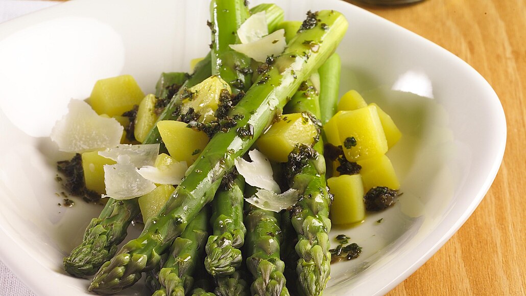 - Když jsou brambory téměř uvařené, dáme vařit do jiné nádoby s osolenou vodou chřest a vaříme ho asi 3 minuty. Brambory scedíme a necháme zakryté. Chřest vyndáme, necháme okapat a rozdělíme na talíře.