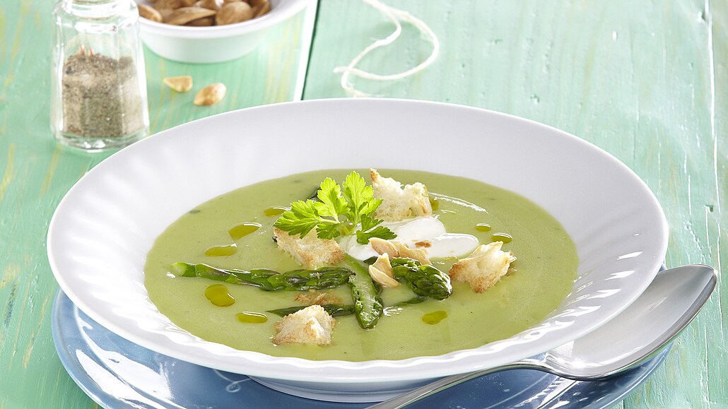 - Polévku dochutíme solí a pepřem. Nakonec v ní necháme rozpustit máslo a již nevaříme. Polévku na talířích ozdobíme hlavičkami vařeného chřestu, opečenými krutony a nasekanými uzenými mandlemi. Nakonec polévku zjemníme lžící zakysané smetany.