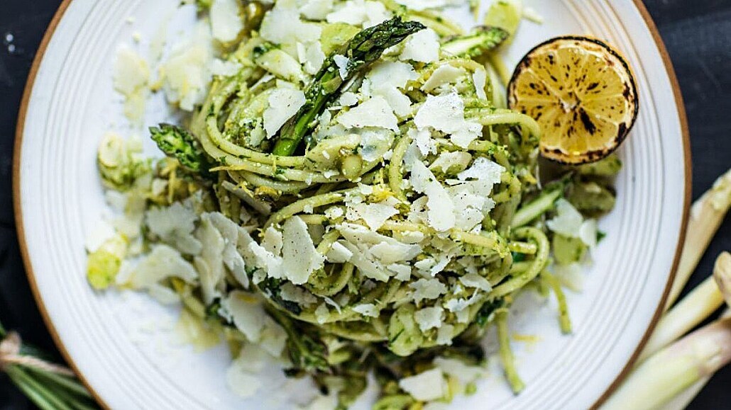 - Mezitím v osolené vodě uvaříme makarony. Uvařené a scezené těstoviny vložíme do pánve s orestovaným chřestem, pestem z medvědího česneku, solí a pepřem.