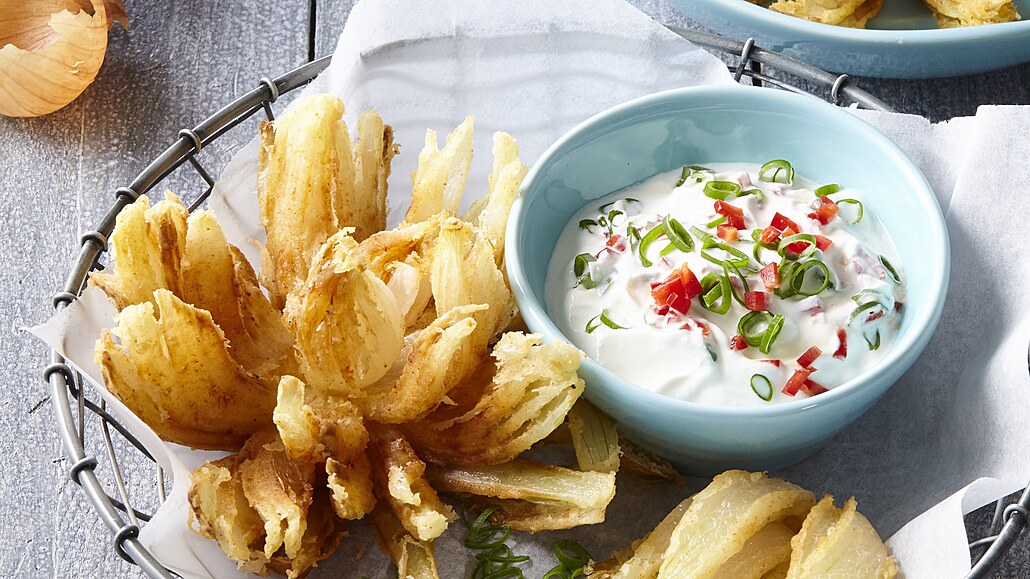 - Obalené cibule smažíme v v hrnci v rozpáleném oleji dozlatova. Pak je vyjmeme, necháme okapat na papírovém ubrousku od přebytečného tuku. Nakonec smažené cibulové květy posypeme hrubou solí.