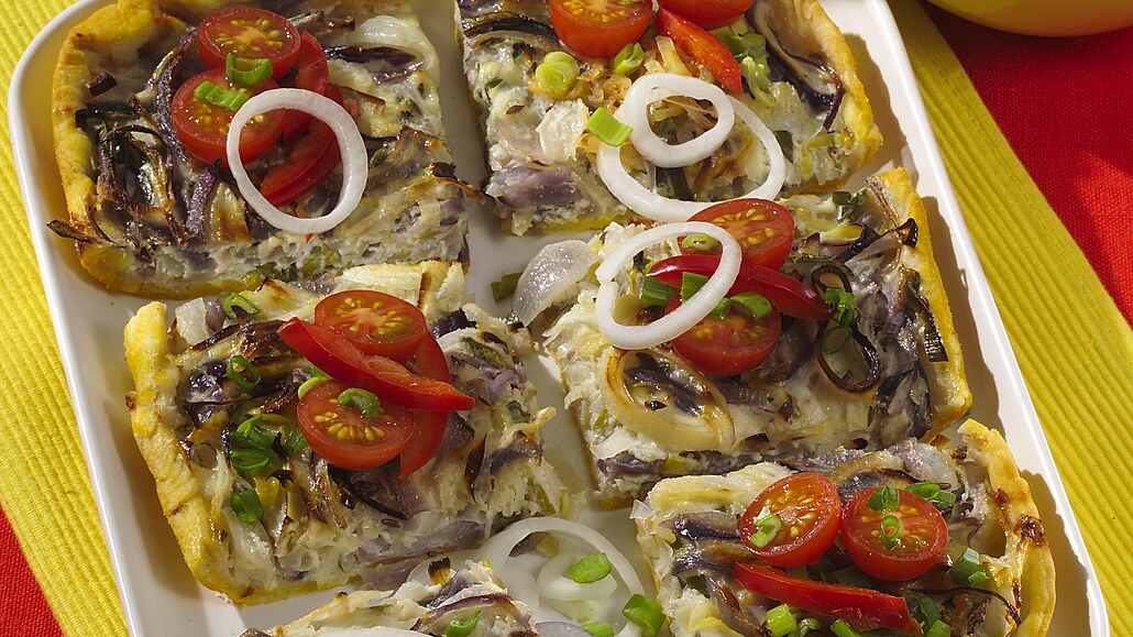 - Odpočaté těsto rozválíme do tvaru obdélníku a položíme jím vymaštěný plech tak, aby okraje těsta byly zvýšené asi o 2 cm. Na těsto rozetřeme cibulovou náplň. Koláč pečeme v troubě předehřáté na 180 °C asi 40 minut. Pokud by koláč rychle červenal, přikryjeme ho alobalem. Hotový koláč podáváme ozdobený koktejlovými rajčátky a nasekanou mladou cibulkou.