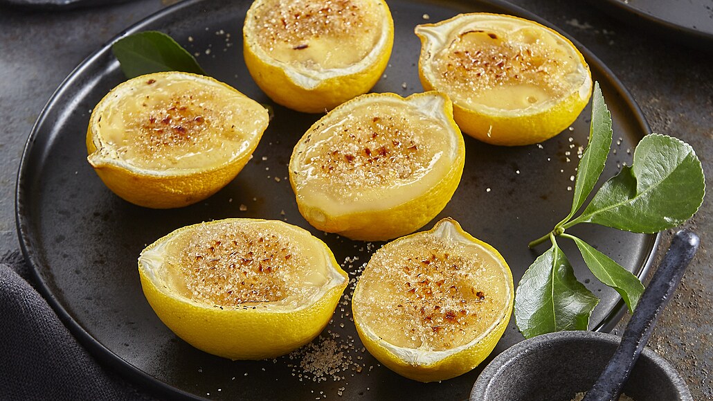 - Přidáme citronovou šťávu. Půlky citronu rozložíme do pekáčku a nalijeme do nich směs. Pečeme ve vyhřáté troubě při 150 °C 30 minut.