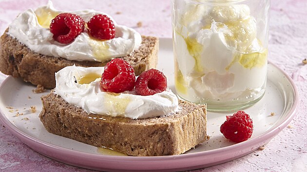 - Po upečení necháme krátce vychladnout a pak vyklopíme na kovovou mřížku. Po vychladnutí nakrájíme a podáváme s ricottou smíchanou s medem a malinami.
