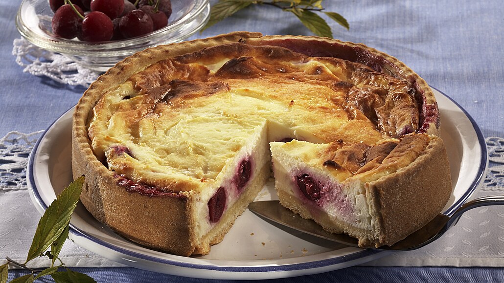 - Předpečený korpus necháme mírně zchladnout. Ze zbylého těsta vyválíme proužek a vyložíme jím obvod formy. Formu naplníme polovinou náplně a višněmi. Ovoce zakryjeme zbylým tvarohem. Povrch uhladíme a koláč vložíme do trouby. Při 180 °C ho dopékáme asi 40 minut.