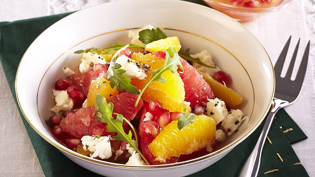 - Pomeranče a grepy okrájíme a vykrájíme z nich filátka. Přidáme opranou a okapanou rukolu a vyloupané granátové jablko. Opatrně promícháme a rozdělíme na talíře.
