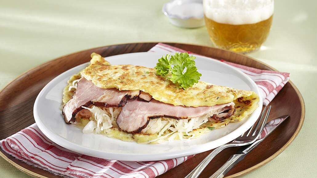 - Z bramborového těsta upečeme na rozehřátém tuku placky. Naplníme je zelím a plátky ohřátého masa. Přehneme je, ozdobíme petrželkou a podáváme.