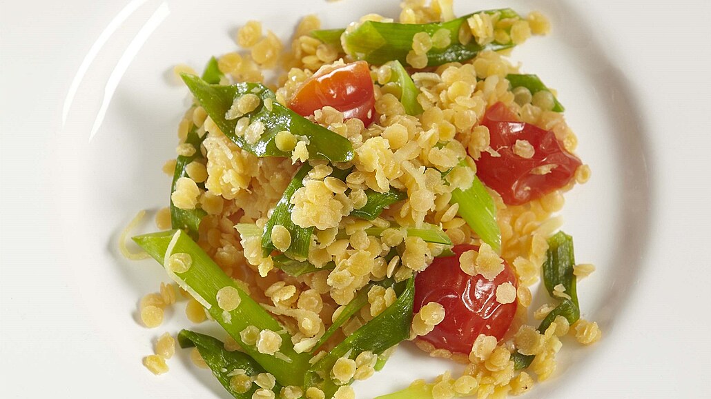 - Mezitím nakrájíme jarní cibulku a orestujeme ji na olivovém oleji společně s nasekaným zázvorem. Přidáme přepůlená rajčátka a nakonec uvařenou čočku. Společně promícháme, ochutíme solí a pepřem.