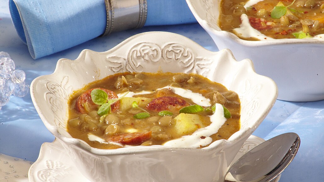 - Do základu přidáme vařenou čočku se zeleninou (i s tekutinou, v níž se vařily) a na kolečka pokrájenou klobásu. Polévku dochutíme solí a pepřem. Přidáme do ní nasekané bylinky a odstavíme ji. Podáváme se zakysanou smetanou.