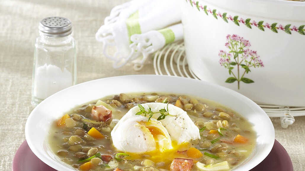 - Mezitím z másla a mouky připravíme světlou jíškou. Rozředíme ji vodou, v níž bobtnala čočka, a přilijeme do hrnce. Polévku vaříme dalších 15 minut. Ke konci přihodíme nadrobno nasekanou cibulovou nať a na malé kostičky nakrájenou klobásu. Polévku dochutíme solí a pepřem. Podáváme se ztraceným vejcem.