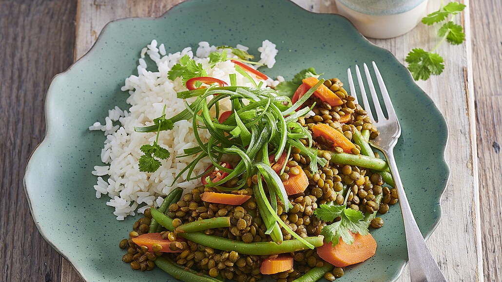 - Ve středně velikém hrnci smícháme čočku a kurkumou a 800 ml vody. Přivedeme k varu a necháme asi 15 minut vařit na mírném ohni. Jakmile čočka změkne, přidáme nakrájenou mrkev s fazolkami, polovinu koriandru a vše dovaříme al dente. Dochutíme solí, kajenským pepřem a přimícháme orestovanou směs koření se zbylým najemno nasekaným koriandrem.