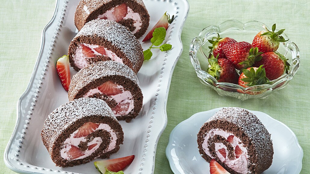 - Smetanu vyšleháme s cukrem na pevnou šlehačku a smícháme s rozmačkanými jahodami. Korpus potřeme jahodovou šlehačkou a na ni rozložíme jahody nakrájené na kousky. Pomocí utěrky stočíme do rolády a necháme v chladu ztuhnout. Před podáváním roládu posypeme moučkovým cukrem a nakrájíme na porce.