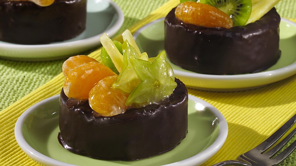 - V hlubší misce rozpustíme čokoládovou polevu a piškotové misky do ní až ke dnu ponoříme, aby poleva byla jak v mističce, tak po stranách dortíčku. Opatrně je položíme na mřížku, aby čokoláda okapala a ztuhla.