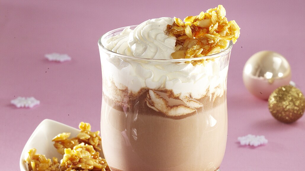 - Zbylou smetanu vyšleháme na pevnou šlehačku. Do čokoládového mléka vmícháme whisky (případně jiný alkohol) a horké nalijeme do připravených sklenic. Ozdobíme šlehačkou a posypeme zkaramelizovanými mandlemi.