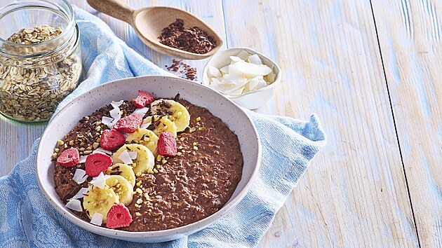 - Ovesné vločky zalijeme mandlovým mlékem, přisypeme chia semínka a necháme asi hodinu odležet. Poté přidáme na kousky rozmačkaný banán, proteinový prášek a strouhaný kokos. Vše krátce promixujeme ponorným mixérem.