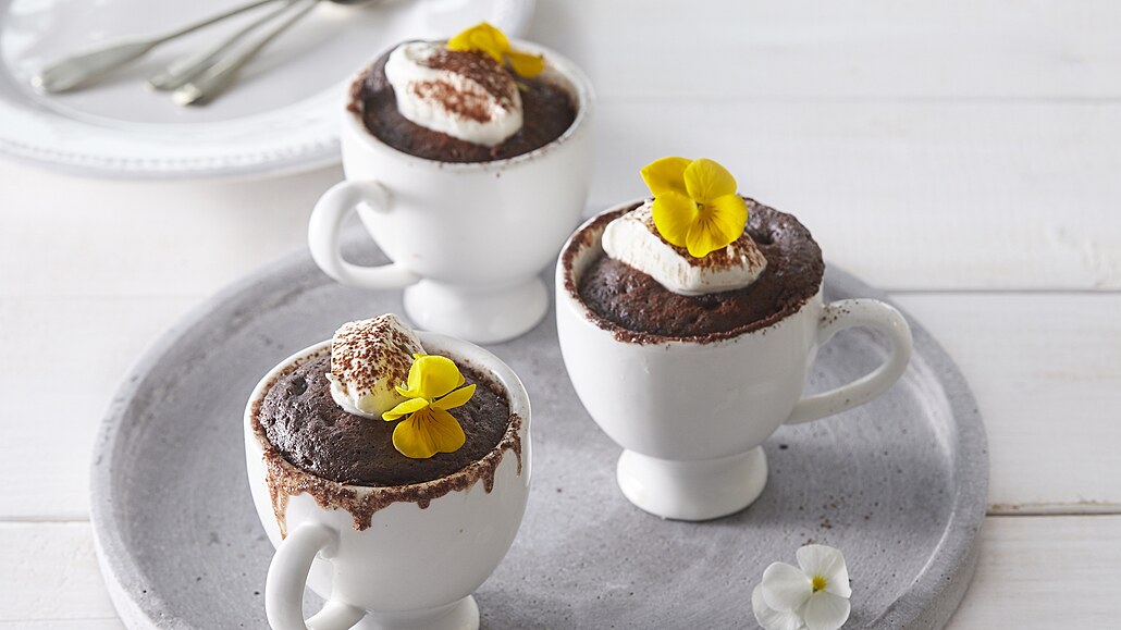 - Těsto rozdělíme do hrnečků vymazaných máslem a vysypaných cukrem. Vložíme na 2-3 minuty do mikrovlnky (při výkonu 900 W). Podáváme se zakysanou smetanou a jedlými květy.