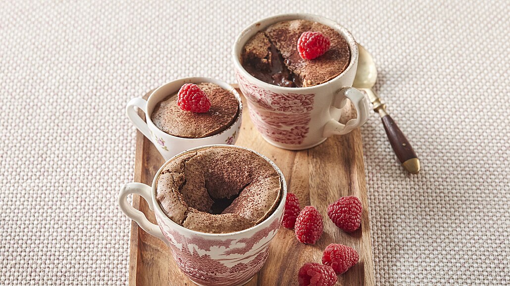 - Nakonec vmícháme prosátou mouku a kakao. Hrnečky vymažeme máslem, na dno dáme očistěné maliny a zalijeme těstem. Pečeme při 170 °C asi 12 minut. Pak je vyjmeme z trouby, posypeme kakaem a doplníme malinami. Podáváme ještě teplé.