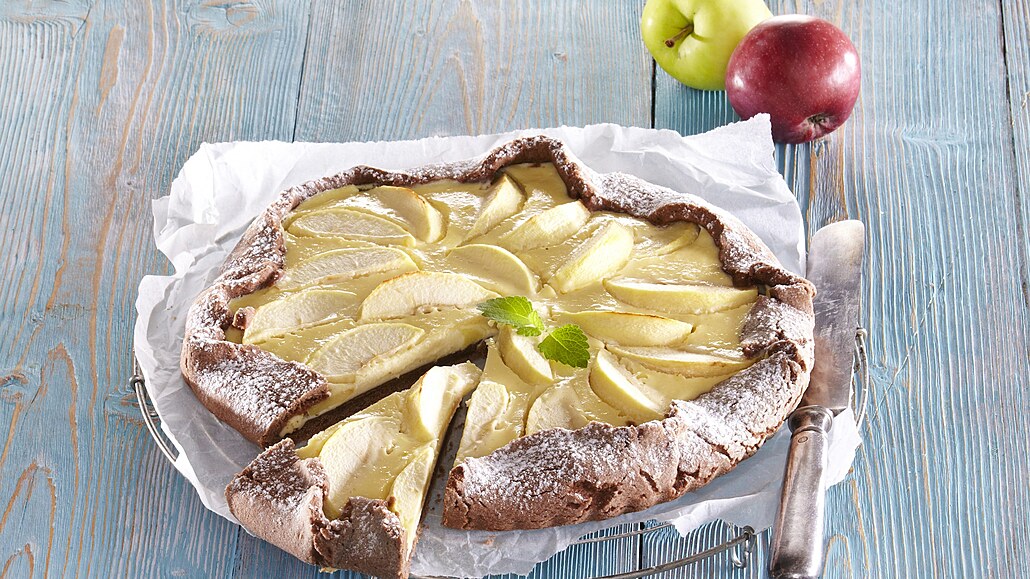 - Odpočinuté těsto rozválíme na kulatý plát a podsuneme pod něj odnímatelné dno kulaté koláčové formy. Do středu těsta naneseme tvarohovou náplň. Na ni položíme plátky jablek. Nepravidelné okraje kakaového těsta zarovnáme a stočíme směrem do středu podél celého koláče.