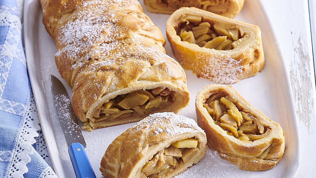 - Těsto rozválíme na plát silný 5 mm. K jednomu okraji těsta nasypeme po celé délce piškoty. Pokud jablka pustila hodně šťávy, přecedíme je přes husté sítko a následně rozložíme na připravené piškoty. Těsto přehneme přes jablka tak, aby byla zcela zabalená, tedy do dvou třetin, zbylou třetinu těsta rozkrájíme rádýlkem na proužky silné 1 cm a vždy ze tří proužků spleteme cop, který přehneme přes závin a založíme pod něj. Takto připravíme copy ze všech pramenů.