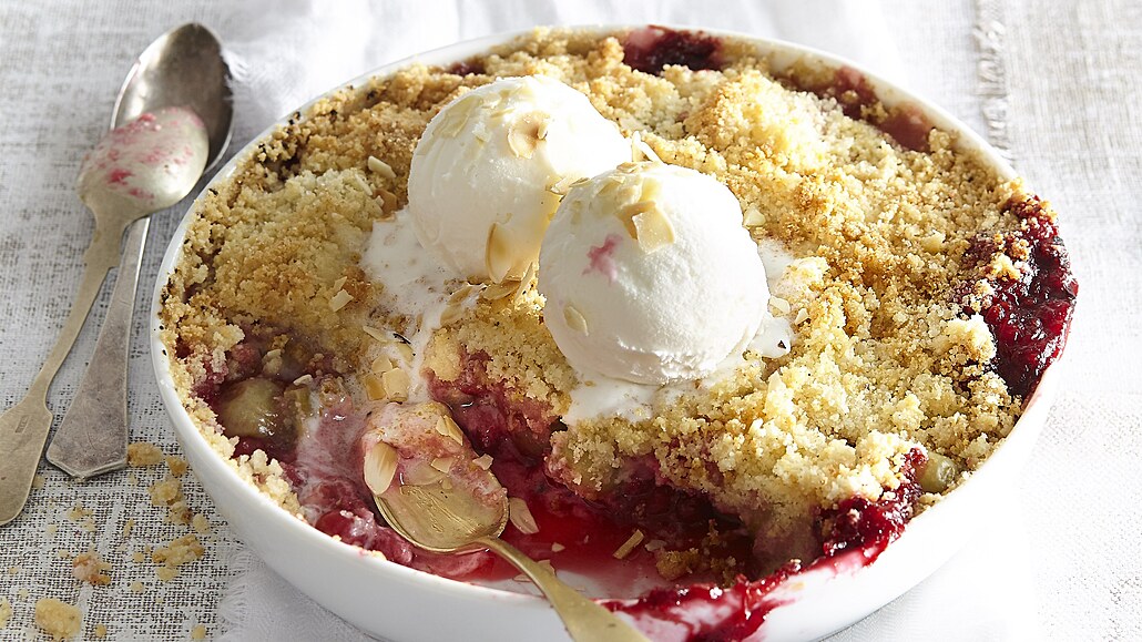 - Na drobenku nastrouháme do mísy máslo, přidáme mouku, cukr a mandle. Vypracujeme drobenku, kterou posypeme ovoce v miskách.