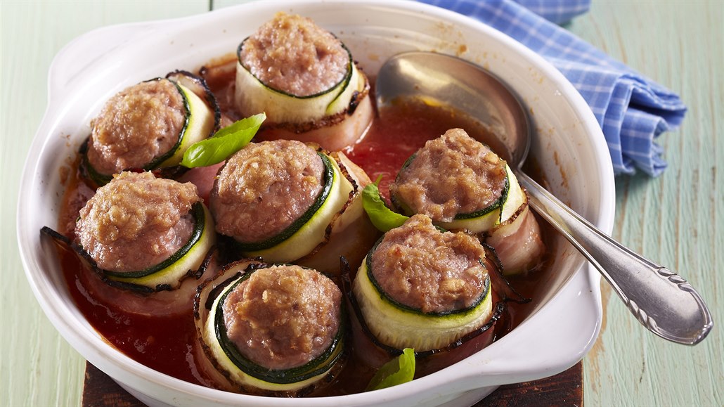 - Z cukety nakrájíme škrabkou 8 plátků. Plátky slaniny rozkrojíme podélně na poloviny. Rukou namočenou ve studené vodě vytvarujeme z masa 8 válečků, které zabalíme nejprve do plátku cukety a pak do plátku slaniny. Závitky narovnáme do zapékací mísy vytřené olejem. Vložíme je do vyhřáté trouby a pečeme při 180 °C asi 15 minut.