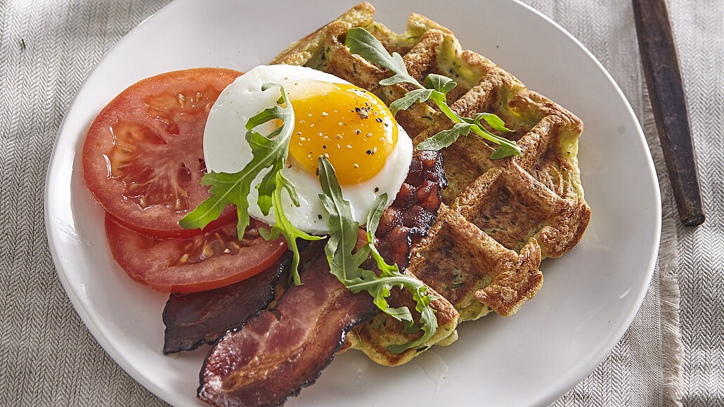 - Hotové vafle podáváme s plátky slaniny, vejcem, rajčaty a rukolou.